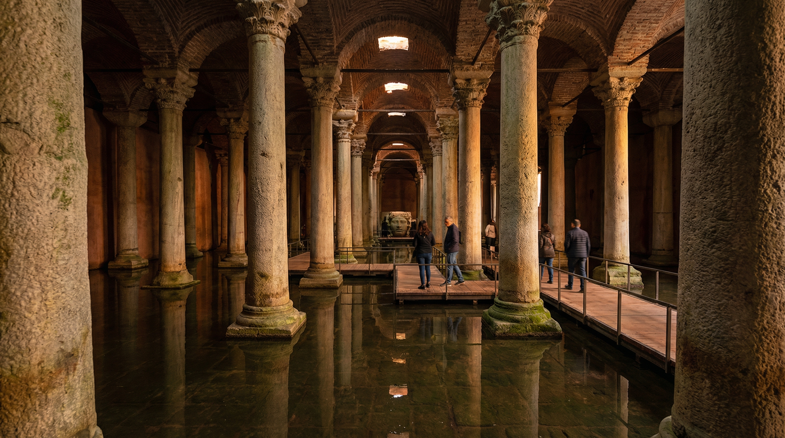 All'interno della Basilica Cisterna, i visitatori possono camminare tra una vasta foresta di 336 colonne di marmo e le acque serene che scorrono sotto. Le colonne stesse sono un punto culminante, con molte delle quali presentano intagli e disegni unici di epoche precedenti. Tra i punti salienti più intriganti ci sono le famose teste di Medusa, posizionate come base delle colonne e che aggiungono un duraturo senso di mistero allo spazio.